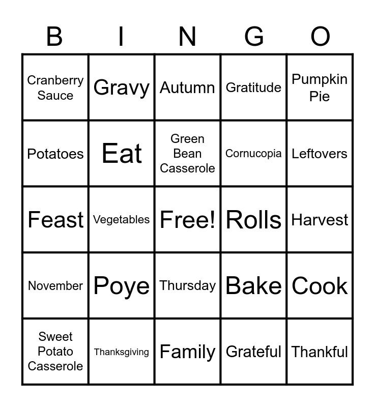 This bingo card has a free space and 24 words: Poye, Thanksgiving, Green Bean Casserole, Sweet Potato Casserole, Pumpkin Pie, Cranberry Sauce, Potatoes, Gravy, Rolls, Thursday, Cornucopia, Feast, Bake, Cook, Eat, Grateful, Harvest, Autumn, Leftovers, Vegetables, Thankful, November, Gratitude and Family.