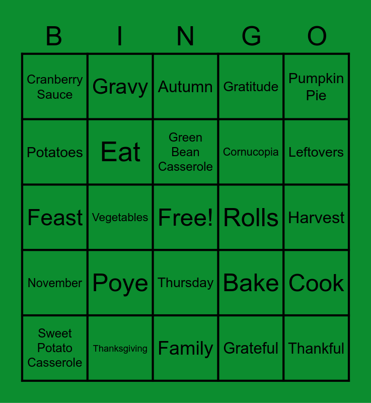 This bingo card has a free space and 24 words: Poye, Thanksgiving, Green Bean Casserole, Sweet Potato Casserole, Pumpkin Pie, Cranberry Sauce, Potatoes, Gravy, Rolls, Thursday, Cornucopia, Feast, Bake, Cook, Eat, Grateful, Harvest, Autumn, Leftovers, Vegetables, Thankful, November, Gratitude and Family.