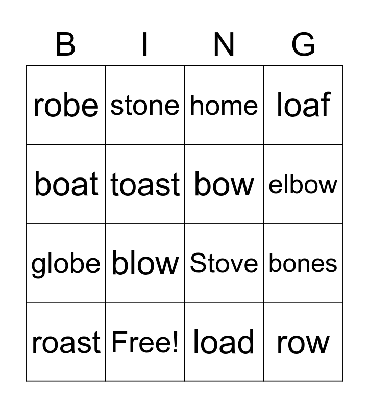 This bingo card has 16 words: Free!, bones, home, robe, globe, stone, Stove, load, boat, toast, roast, loaf, blow, elbow, bow and row.