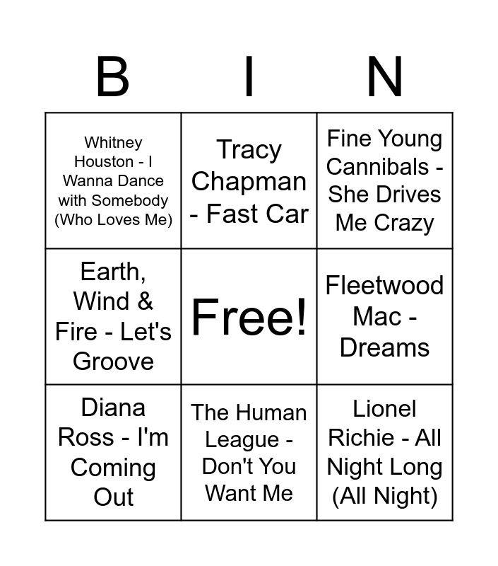 This bingo card has a free space and 36 words: Steve Winwood - Higher Love, New Order - Blue Monday '88, Daryl Hall & John Oates - You Make My Dreams (Come True), Diana Ross - I'm Coming Out, Whitney Houston - How Will I Know, Phil Collins - Sussudio, The Human League - Don't You Want Me, Rick James - Super Freak, Lionel Richie - All Night Long (All Night), The Buggles - Video Killed The Radio Star, David Bowie - Let's Dance - 1999 Remaster, Earth, Wind & Fire - Let's Groove, Prince - Kiss, Kim Carnes - Bette Davis Eyes, Soft Cell - Tainted Love, Whitney Houston - I Wanna Dance with Somebody (Who Loves Me), Rockwell - Somebody's Watching Me, Britney Spears - Toxic, KC & The Sunshine Band - Give It Up, Fine Young Cannibals - She Drives Me Crazy, Empire of the Sun - Walking On A Dream, Vampire Weekend - A-Punk, Two Door Cinema Club - What You Know, Phoenix - 1901, Matt and Kim - Daylight, Tracy Chapman - Fast Car, Culture Club - Karma Chameleon - Remastered, Stardust - Music Sounds Better With You, 24kGoldn - Mood (feat. iann dior), Fleetwood Mac - Dreams, Daft Punk - One More Time, Talking Heads - This Must Be the Place (Naive Melody), Violent Femmes - Blister In The Sun, Earth, Wind & Fire - September, John Farnham - Pressure Down and INXS - Need You Tonight.