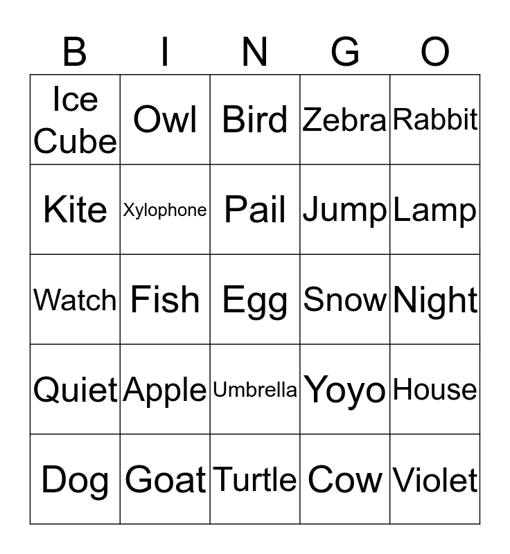 This bingo card has a free space and 24 words: Apple, Goat, Pail, Dog, Rabbit, Ice Cube, Kite, Owl, Snow, Umbrella, Jump, Watch, Yoyo, House, Xylophone, Cow, Night, Bird, Lamp, Fish, Violet, Quiet, Zebra and Turtle.