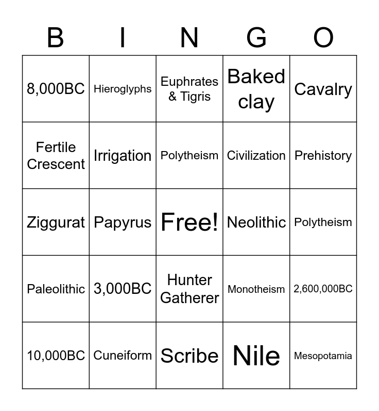This bingo card has a free space and 28 words: 2,600,000BC, Old Kingdom, Civilization, Nile, Fertile Crescent, Euphrates & Tigris, Hieroglyphs, Paleolithic, Neolithic, 10,000BC, Ziggurat, Baked clay, Cuneiform, Scribe, Prehistory, Hammurabi's Code, 3,000BC, Irrigation, Polytheism, Hunter Gatherer, 8,000BC, Pyramids, Mesopotamia, Papyrus, Polytheism, Monotheism, Cavalry and Cave Art.