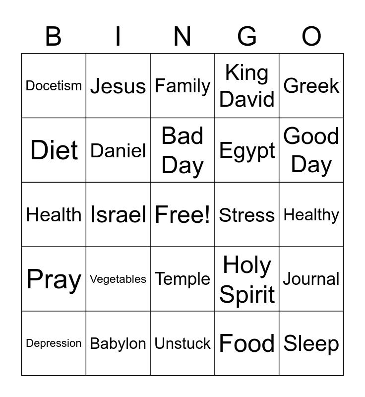 This bingo card has a free space and 30 words: Babylon, Therapy, Israel, Drink, Docetism, Family, Daniel, Temple, Stress, Unstuck, Healthy, Sleep, Food, Royal, Good Day, Christianity, Holy Spirit, Pray, Vegetables, Greek, Health, Plan, Jesus, Egypt, Diet, King David, Journal, Depression, Bad Day and Water.