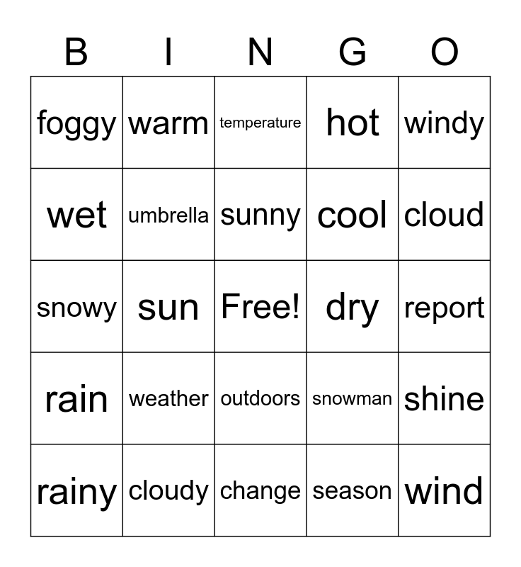This bingo card has a free space and 24 words: weather, cloudy, sunny, rainy, windy, foggy, wet, warm, dry, outdoors, cool, snowy, snowman, shine, umbrella, season, report, temperature, cloud, sun, wind, rain, hot and change.