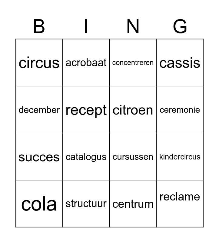 This bingo card has 18 words: catalogus, reclame, concentreren, circus, cursussen, cassis, cola, acrobaat, ceremonie, succes, centrum, december, kindercircus, recept, citroen, project, structuur and citaat.