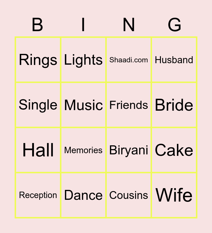 This bingo card has 24 words: Guest, Groom, Bride, Flower, Single, Rings, Music, Lights, Dance, Family, Hall, Biryani, Camera, Gifts, Friends, Tie, Cousins, Shaadi.com, Memories, Cake, Reception, Wife, Husband and Fairy tale.