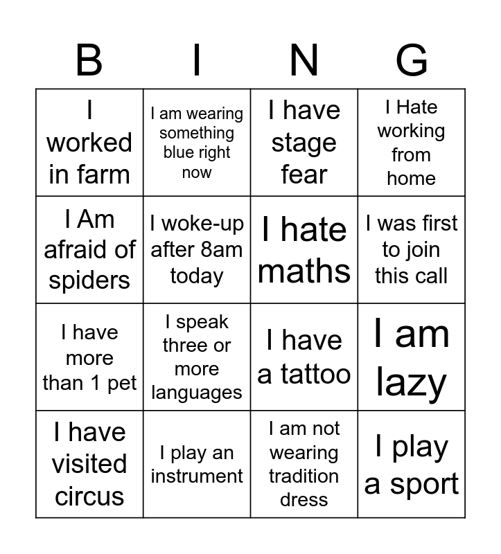This bingo card has 29 words: Free!, I Hate reading books, I am lazy, I have met a celebrity, I worked in farm, I have stage fear, I hate maths, I hate programming, I play an instrument, I know a magic trick, I am not wearing tradition dress, I have visited circus, I am wearing something pink right now, I can not cook, I speak three or more languages, I Have spent a night at airport, I have never played Ludo, I play a sport, I Am afraid of spiders, I have a tattoo, I was born in November, I am wearing tradition dress, I have more than 1 pet, I woke-up after 8am today, I Hate working from home, I am wearing something blue right now, I have attended video call with business coat and night wear pants, I was first to join this call and My name has a ‘A’ in it.