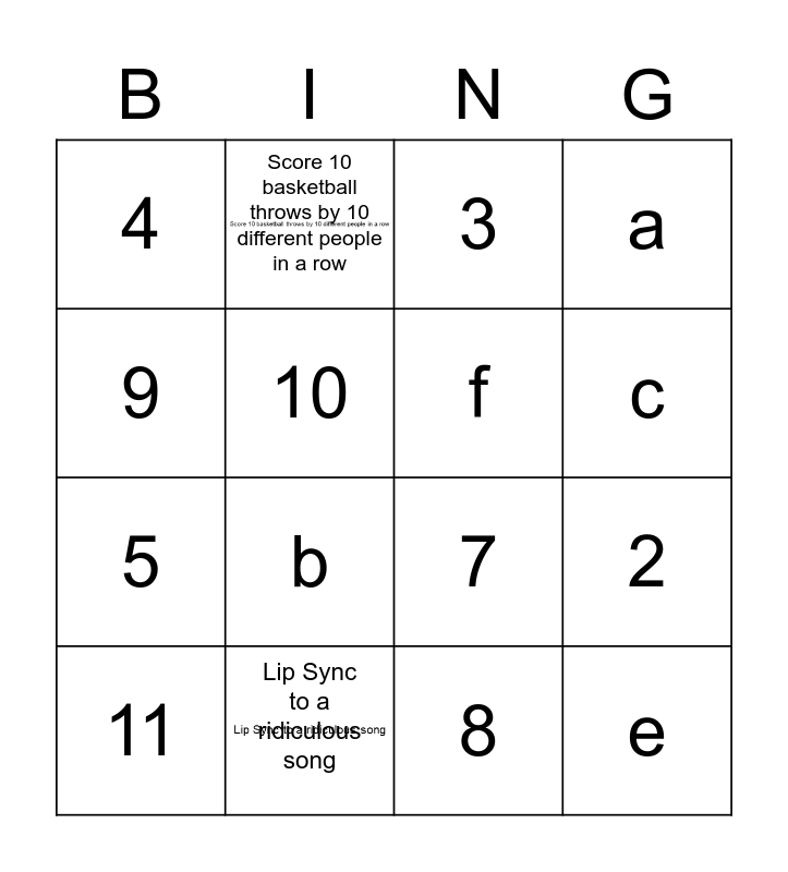This bingo card has 2 images and 16 words: Lip Sync to a ridiculous song, 2, 3, 4, 5, Score 10 basketball throws by 10 different people in a row, 7, 8, 9, 10, 11, a, b, c, f and e.
