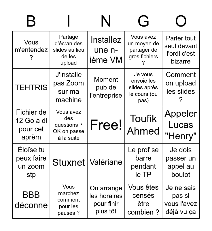This bingo card has a free space and 24 words: Stuxnet, Vous marchez comment pour les pauses ?, Moment pub de l'entreprise, BBB déconne, Parler tout seul devant l'ordi c'est bizarre, Vous m'entendez ?, TEHTRIS, Partage d'écran des slides au lieu de les upload, Toufik Ahmed, Valériane, Je vous envoie les slides après le cours (ou pas), Fichier de 12 Go à dl pour cet aprèm, Le prof se barre pendant le TP, Je dois passer un appel au boulot, J'installe pas Zoom sur ma machine, Vous êtes censés être combien ?, Appeler Lucas "Henry", Installez une n-ième VM, Comment on upload les slides ?, Vous avez des questions ? OK on passe à la suite, Je ne sais pas si vous l'avez déjà vu ça, Éloïse tu peux faire un zoom stp, Vous avez un moyen de partager de gros fichiers ? and On arrange les horaires pour finir plus tôt.