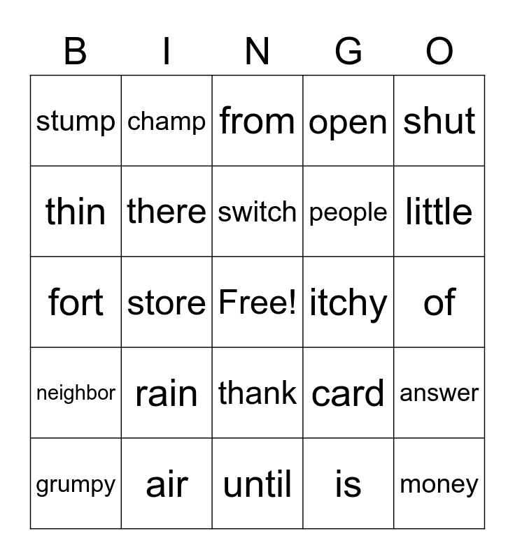 This bingo card has a free space and 24 words: rain, air, switch, grumpy, shut, stump, thin, champ, itchy, thank, people, fort, card, answer, there, is, of, from, little, store, money, neighbor, open and until.