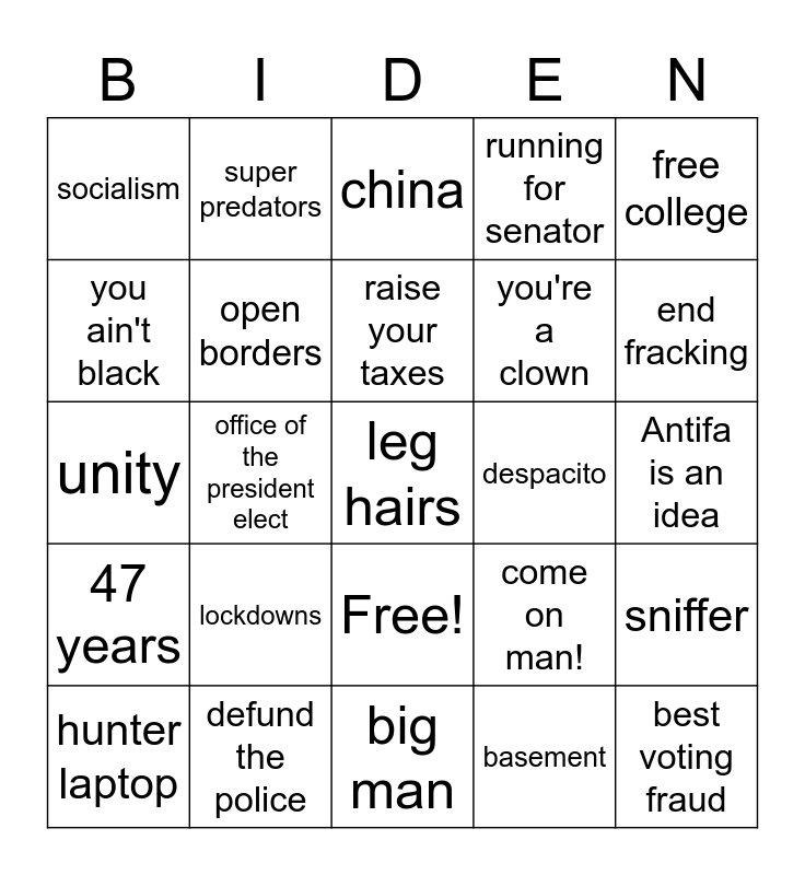 This bingo card has 26 words: Free!, basement, raise your taxes, defund the police, free college, socialism, you ain't black, super predators, Antifa is an idea, come on man!, you're a clown, unity, sniffer, hunter laptop, office of the president elect, xenophobic, running for senator, 47 years, china, leg hairs, end fracking, big man, despacito, lockdowns, open borders and best voting fraud.