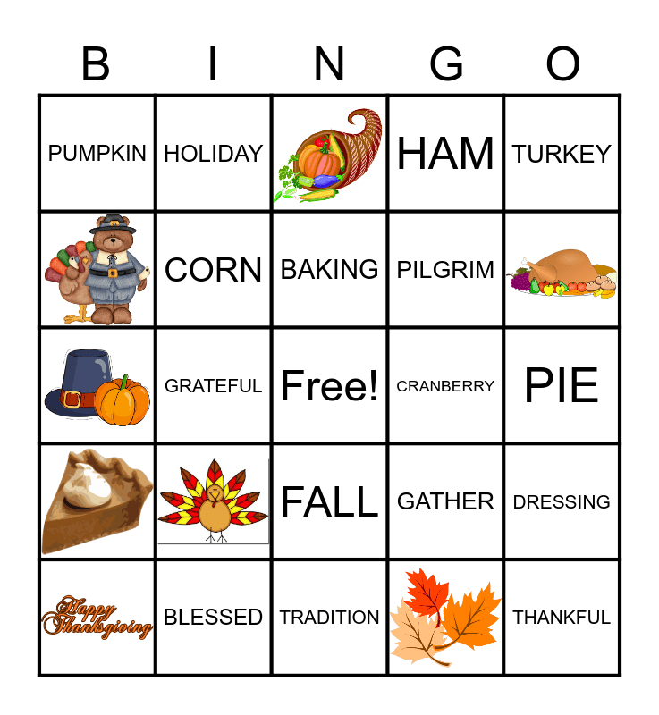 This bingo card has 10 images, a free space and 19 words: FAMILY, GRATEFUL, PUMPKIN, CORN, CRANBERRY, BLESSED, PIE, THANKFUL, TRADITION, PARADE, FALL, TURKEY, GATHER, PILGRIM, HAM, HOLIDAY, DRESSING, BAKING and FRIENDS.