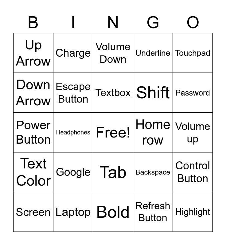 This bingo card has a free space and 24 words: Google, Laptop, Textbox, Screen, Touchpad, Up Arrow, Down Arrow, Charge, Home row, Tab, Shift, Power Button, Backspace, Control Button, Escape Button, Refresh Button, Volume up, Volume Down, Password, Headphones, Highlight, Text Color, Underline and Bold.