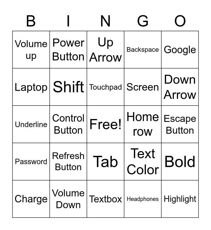 This bingo card has a free space and 24 words: Refresh Button, Volume Down, Touchpad, Charge, Google, Volume up, Laptop, Power Button, Home row, Tab, Screen, Underline, Text Color, Bold, Shift, Headphones, Escape Button, Up Arrow, Down Arrow, Control Button, Highlight, Password, Backspace and Textbox.