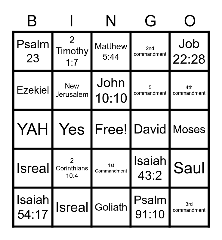 This bingo card has a free space and 24 words: Isaiah 54:17, 2 Corinthians 10:4, John 10:10, Psalm 91:10, Job 22:28, Psalm 23, 2 Timothy 1:7, Matthew 5:44, David, Moses, YAH, New Jerusalem, Isaiah 43:2, Saul, Ezekiel, Isreal, Goliath, 2nd commandment, 4th commandment, Isreal, Yes, 1st Commandment, 5 commandment and 3rd commandment.