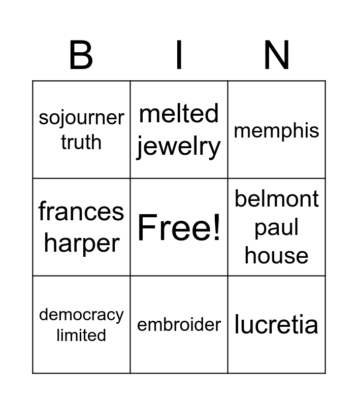 This bingo card has a free space and 74 words: Nashville, knoxville, memphis, big business, menace to the home, unpatriotic, henpecked, democrats, republicans, senators, clean politics, clean food, embroider, belmont paul house, pickett, white house, president, Occoquan workhouse, prison special, silent sentinels, democracy limited, melted jewelry, frances harper, anna cooper, Tennessee, suffrage, alice, paul, susan, anthony, lucretia, mott, elizabeth, cady, stanton, carrie, chapman, catt, seneca falls, mill workers, masculine, liquor industry, prohibition, anti-suffrage, Ida B Wells, sojourner truth, nannie burroughs, elizabeth ensley, hermitage hotel, special session, josephine pearson, anne dudley, abby milton, frankie pierce, lizzie crozier french, sue shelton white, harry burn, febb burn, declaration of sentiments, governor roberts, president woodrow wilson, voter registration, 36th state, equal rights amendment, capitol building, jail, suffrage march, abigail adams, property laws, abolitionist movement, mill workers union, frederick douglass, antis and cuffs.