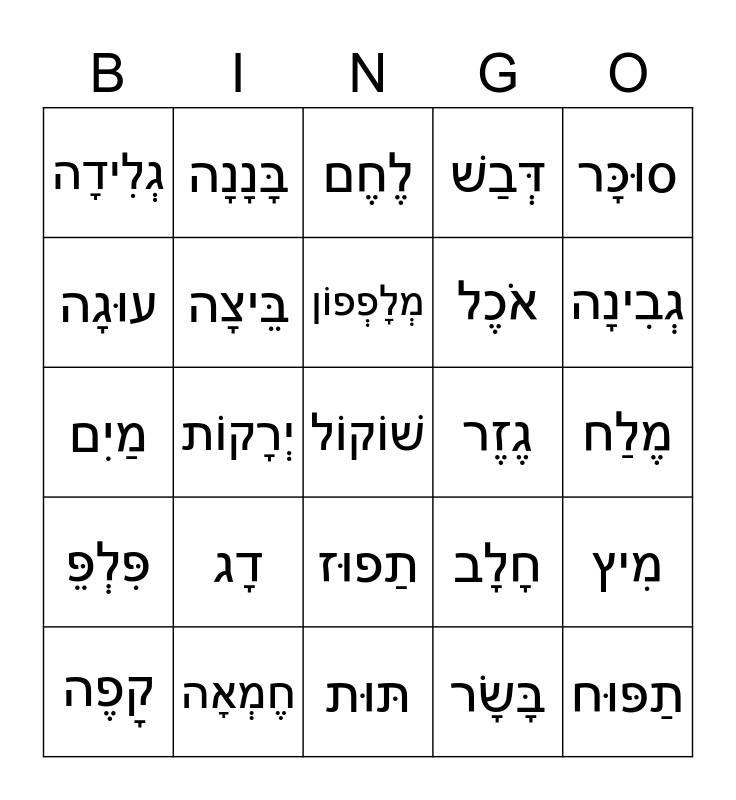 This bingo card has 25 words: דָג, תּוּת, מְלָפְפוֹן, קָפֶה, סוּכָּר, גְלִידָה, עוּגָה, בָּנָנָה, גֶזֶר, תַפוּז, אֹכֶל, מַיִם, חָלָב, מִיץ, בֵּיצָה, תַפּוּח, מֶלַח, לֶחֶם, גְבִינָה, יְרָקוֹת, שׁוֹקוֹל, חֶמְאָה, פִּלְפֵּ, דְּבַשׁ and בָּשָׂר.