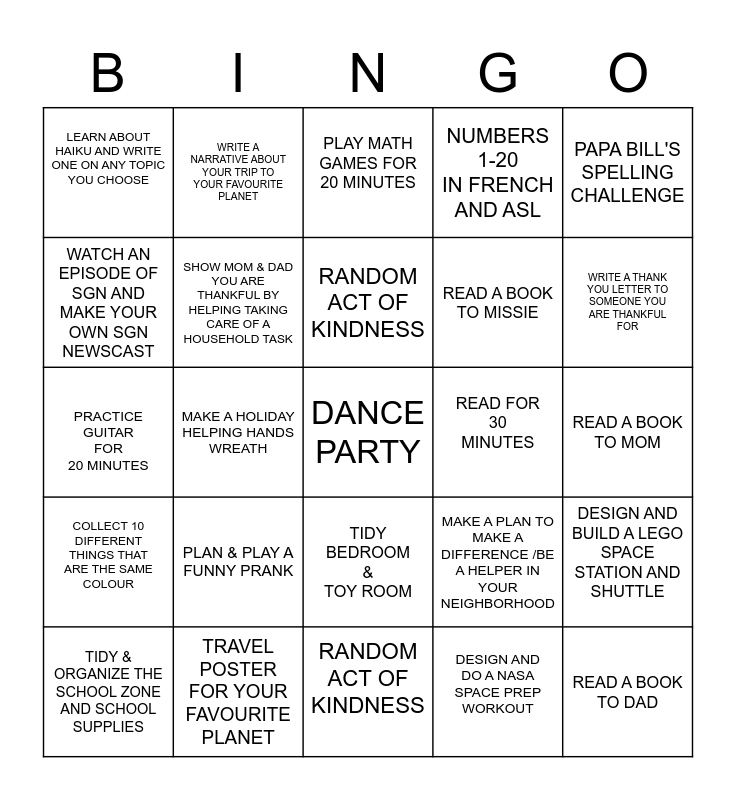 This bingo card has a free space and 24 words: PLAN & PLAY A FUNNY PRANK, TRAVEL POSTER FOR YOUR FAVOURITE PLANET, RANDOM ACT OF KINDNESS, TIDY & ORGANIZE THE SCHOOL ZONE AND SCHOOL SUPPLIES, PAPA BILL'S SPELLING CHALLENGE, LEARN ABOUT HAIKU AND WRITE ONE ON ANY TOPIC YOU CHOOSE, WATCH AN EPISODE OF SGN AND MAKE YOUR OWN SGN NEWSCAST, WRITE A NARRATIVE ABOUT YOUR TRIP TO YOUR FAVOURITE PLANET, READ FOR 30 MINUTES, TIDY BEDROOM & TOY ROOM, READ A BOOK TO MISSIE, PRACTICE GUITAR FOR 20 MINUTES, MAKE A PLAN TO MAKE A DIFFERENCE /BE A HELPER IN YOUR NEIGHBORHOOD, DESIGN AND BUILD A LEGO SPACE STATION AND SHUTTLE, SHOW MOM & DAD YOU ARE THANKFUL BY HELPING TAKING CARE OF A HOUSEHOLD TASK, DESIGN AND DO A NASA SPACE PREP WORKOUT, READ A BOOK TO MOM, PLAY MATH GAMES FOR 20 MINUTES, WRITE A THANK YOU LETTER TO SOMEONE YOU ARE THANKFUL FOR, MAKE A HOLIDAY HELPING HANDS WREATH, READ A BOOK TO DAD, COLLECT 10 DIFFERENT THINGS THAT ARE THE SAME COLOUR, NUMBERS 1-20 IN FRENCH AND ASL and RANDOM ACT OF KINDNESS.