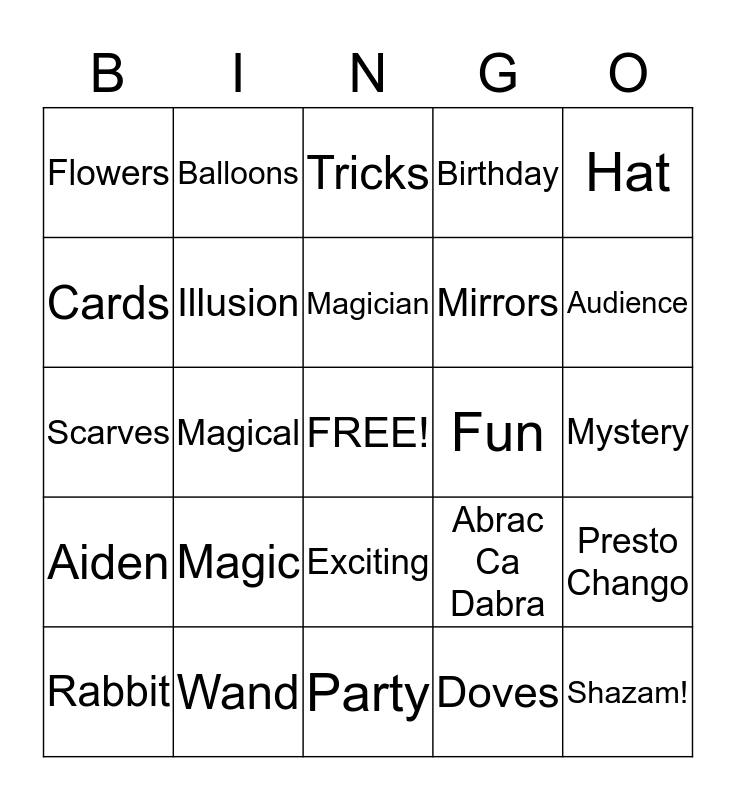This bingo card has a free space and 24 words: Magic, Wand, Magician, Rabbit, Hat, Flowers, Cards, Balloons, Fun, Exciting, Mirrors, Scarves, Abrac Ca Dabra, Presto Chango, Illusion, Doves, Mystery, Tricks, Audience, Magical, Shazam!, Aiden, Birthday and Party.