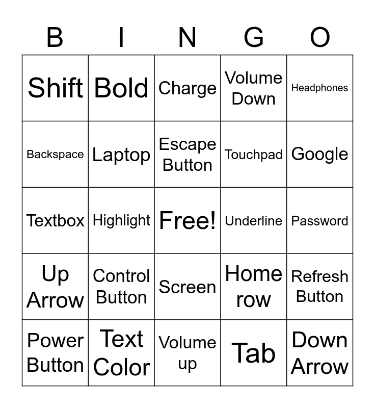 This bingo card has a free space and 24 words: Control Button, Text Color, Escape Button, Power Button, Headphones, Shift, Backspace, Bold, Underline, Screen, Touchpad, Textbox, Home row, Refresh Button, Laptop, Tab, Password, Charge, Google, Highlight, Down Arrow, Up Arrow, Volume Down and Volume up.