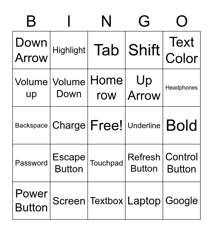 This bingo card has a free space and 24 words: Escape Button, Screen, Home row, Power Button, Text Color, Down Arrow, Volume up, Highlight, Underline, Touchpad, Up Arrow, Backspace, Refresh Button, Control Button, Volume Down, Laptop, Bold, Tab, Headphones, Charge, Google, Password, Shift and Textbox.