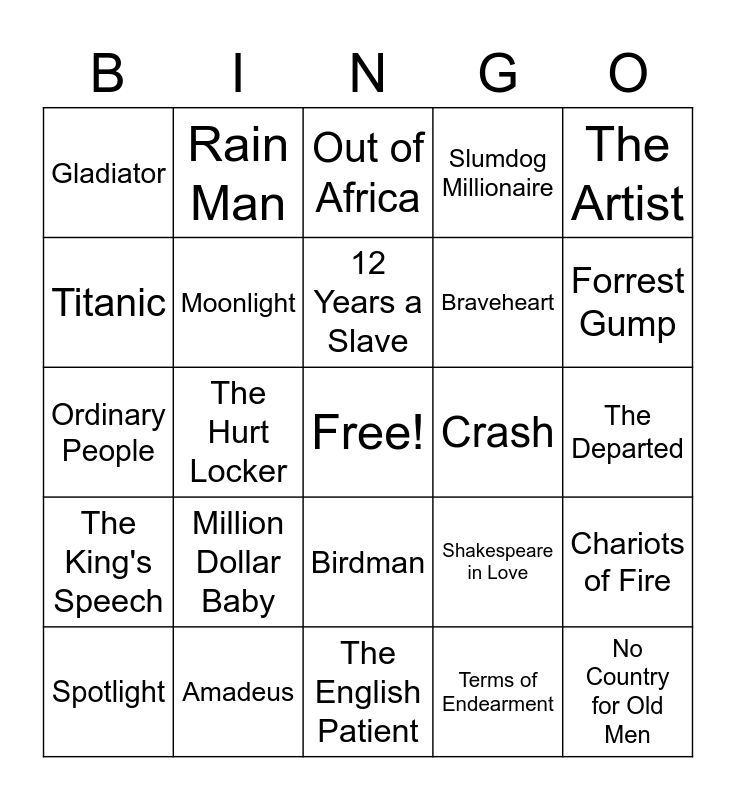 This bingo card has a free space and 39 words: Parasite, Green Book, The Shape of Water, Moonlight, Spotlight, Birdman, 12 Years a Slave, Argo, The Artist, The King's Speech, The Hurt Locker, Slumdog Millionaire, No Country for Old Men, The Departed, Crash, Million Dollar Baby, The Lord of the Rings: Return of the King, Gladiator, American Beauty, Shakespeare in Love, Titanic, The English Patient, Braveheart, Forrest Gump, Schindler's List, Unforgiven, The Silence of the Lambs, Dances With Wolves, Driving Miss Daisy, Rain Man, The Last Emperor, Platoon, Out of Africa, Amadeus, Terms of Endearment, Gandhi, Chariots of Fire, Ordinary People and Chicago.