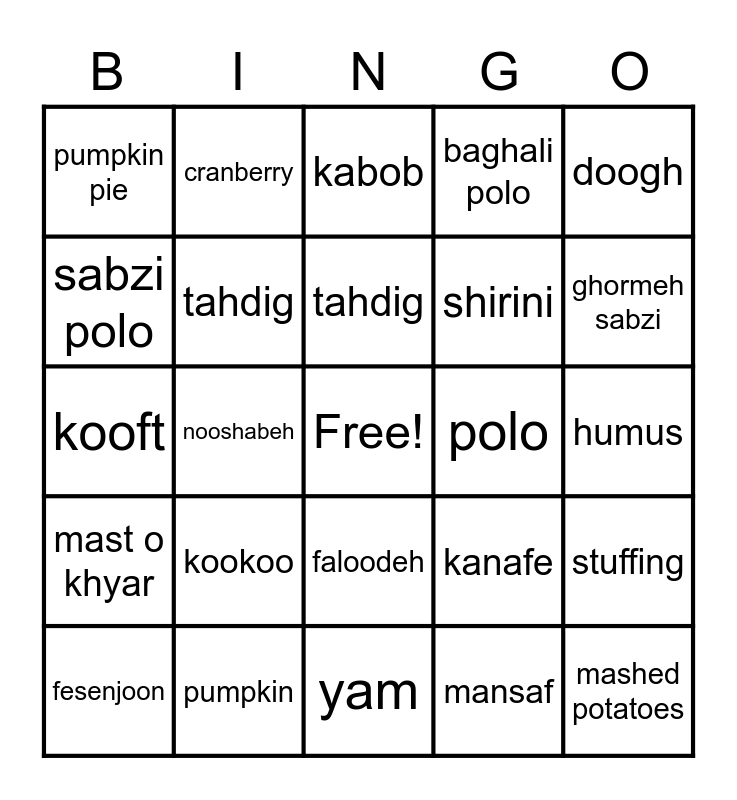 This bingo card has a free space and 29 words: fesenjoon, turkey, nooshabeh, kookoo, pumpkin pie, kabob, tahdig, kookoo, polo, pumpkin, humus, mashed potatoes, yam, mansaf, ghormeh sabzi, chaey, faloodeh, mast o khyar, doogh, kooft, kanafe, apple pie, shirini, sabzi polo, baghali polo, cranberry, stuffing, tahdig and kookoo.