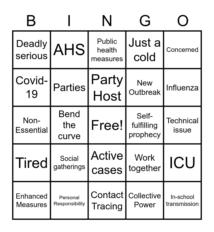 This bingo card has a free space and 24 words: Social gatherings, Personal Responsibility, Party Host, Enhanced Measures, Concerned, Deadly serious, Covid-19, AHS, Self-fulfilling prophecy, Active cases, New Outbreak, Non-Essential, Work together, ICU, Parties, Collective Power, Technical issue, Public health measures, Influenza, Bend the curve, In-school transmission, Tired, Just a cold and Contact Tracing.