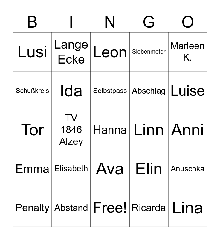 This bingo card has 31 words: Free!, Hockey, TV 1846 Alzey, Mädchen-C, Lusi, Leon, Ida, Elin, Linn, Ricarda, Anni, Hanna, Lina, Clara, Luise, Käthe, Anuschka, Elisabeth, Emma, Ava, Marleen K., Marleen D., Penalty, Lange Ecke, Abschlag, Schußkreis, Siebenmeter, Tor, Abstand, Selbstpass and Freischlag.