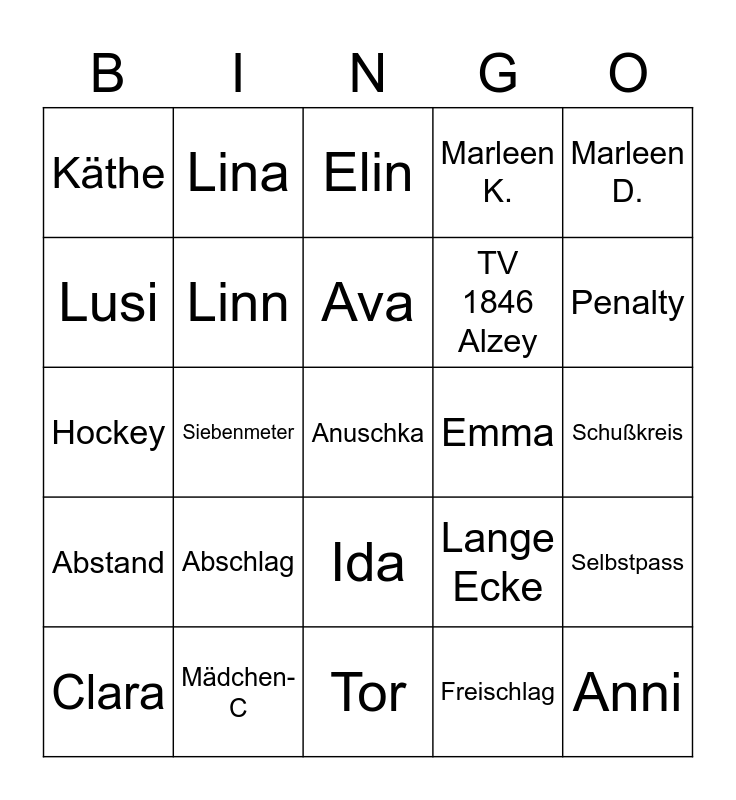 This bingo card has 30 words: Mädchen-C, Hanna, Siebenmeter, Ricarda, Käthe, Elin, Linn, Ida, Emma, Tor, Schußkreis, Anuschka, Freischlag, Anni, Penalty, Luise, Lange Ecke, Abstand, Abschlag, Marleen D., Hockey, Elisabeth, Lina, TV 1846 Alzey, Lusi, Marleen K., Selbstpass, Clara, Ava and Leon.