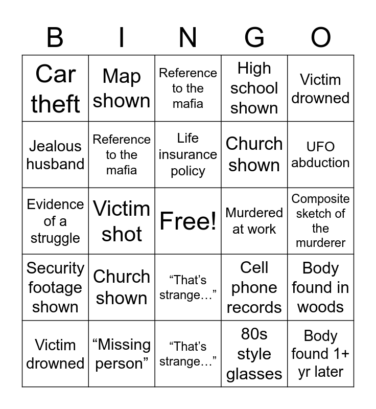 This bingo card has a free space and 42 words: Jealous husband, Life insurance policy, High school shown, Church shown, 80s style glasses, Body found in woods, Body found 1+ yr later, Murdered at work, Reference to the mafia, “That’s strange…”, Composite sketch of the murderer, UFO abduction, Victim shot, Victim drowned, Security footage shown, Cell phone records, Car theft, Evidence of a struggle, Hotel murder, Map shown, Jealous husband, Composite sketch of the murderer, Evidence of a struggle, Car theft, Map shown, Life insurance policy, Church shown, Wedding photos / video, Body found in woods, UFO abduction, Victim shot, Security footage shown, Reference to the mafia, “That’s strange…”, Hotel murder, Victim drowned, “Missing person”, Murdered at work, Body found 1+ yr later, 80s style glasses, High school shown and Cell phone records.