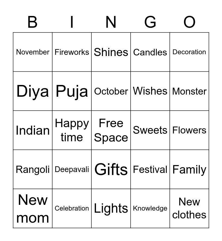 This bingo card has a free space and 24 words: Deepavali, Celebration, October, New mom, Decoration, November, Diya, Fireworks, Sweets, Gifts, Wishes, Indian, Festival, Family, Puja, Knowledge, Flowers, Shines, Monster, Happy time, New clothes, Rangoli, Candles and Lights.