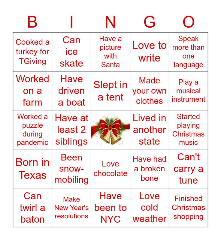 This bingo card has a free space and 24 words: Been snow-mobiling, Make New Year's resolutions, Slept in a tent, Can twirl a baton, Speak more than one language, Cooked a turkey for TGiving, Worked on a farm, Can ice skate, Lived in another state, Love chocolate, Made your own clothes, Worked a puzzle during pandemic, Have had a broken bone, Can't carry a tune, Have driven a boat, Love cold weather, Started playing Christmas music, Have a picture with Santa, Play a musical instrument, Have at least 2 siblings, Finished Christmas shopping, Born in Texas, Love to write and Have been to NYC.