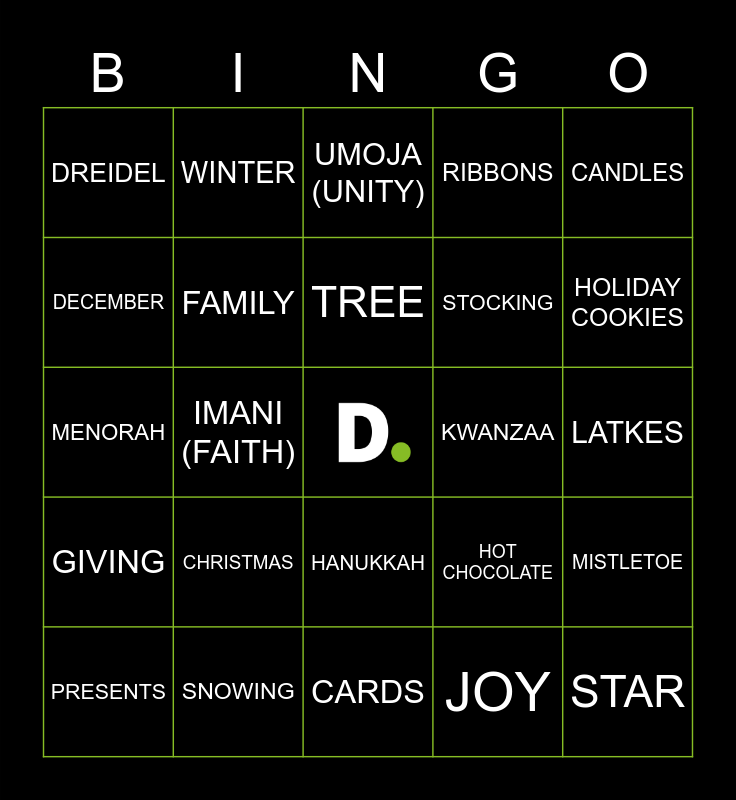 This bingo card has a free space and 24 words: CHRISTMAS, SNOWING, TREE, PRESENTS, CANDLES, DREIDEL, DECEMBER, WINTER, KWANZAA, HANUKKAH, STOCKING, MENORAH, HOT CHOCOLATE, MISTLETOE, FAMILY, JOY, LATKES, UMOJA (UNITY), HOLIDAY COOKIES, IMANI (FAITH), STAR, GIVING, RIBBONS and CARDS.