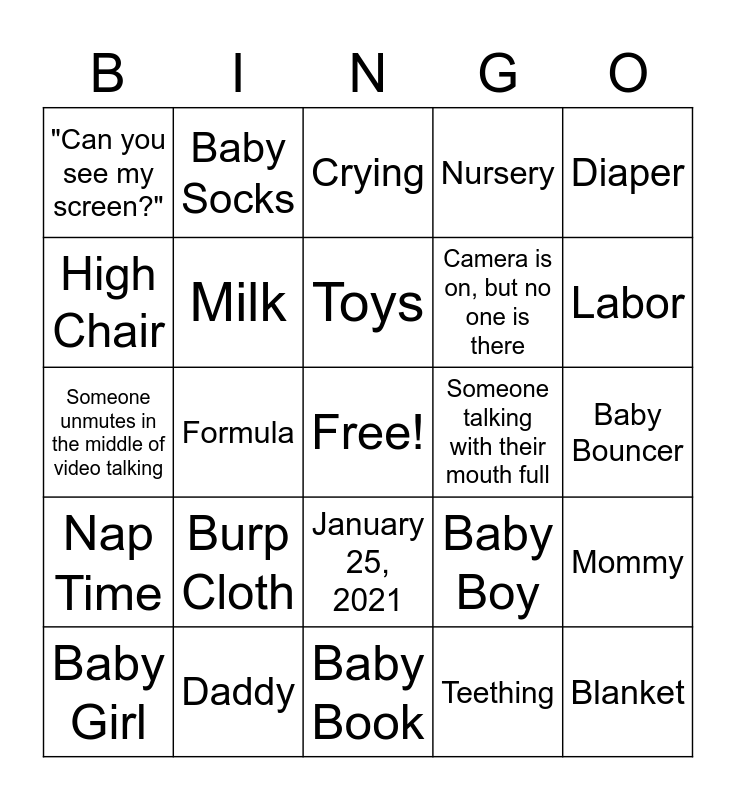 This bingo card has a free space and 35 words: Bottle, Car Seat, Ultra- Sound, Milk, January 25, 2021, Nursery, High Chair, Cradle, Toys, "I can't hear you, you're on mute", Someone unmutes in the middle of video talking, Diaper, Pacifier, Stroller, "Can you see my screen?", Someone talking with their mouth full, Teething, Formula, Nap Time, Blanket, Baby Boy, Baby Girl, Mommy, Daddy, Crying, Labor, Private chat sent to everyone, Due Date, Camera is on, but no one is there, Baby Bouncer, Onesie, Baby Book, Burp Cloth, Baby Socks and Hooded Towel.