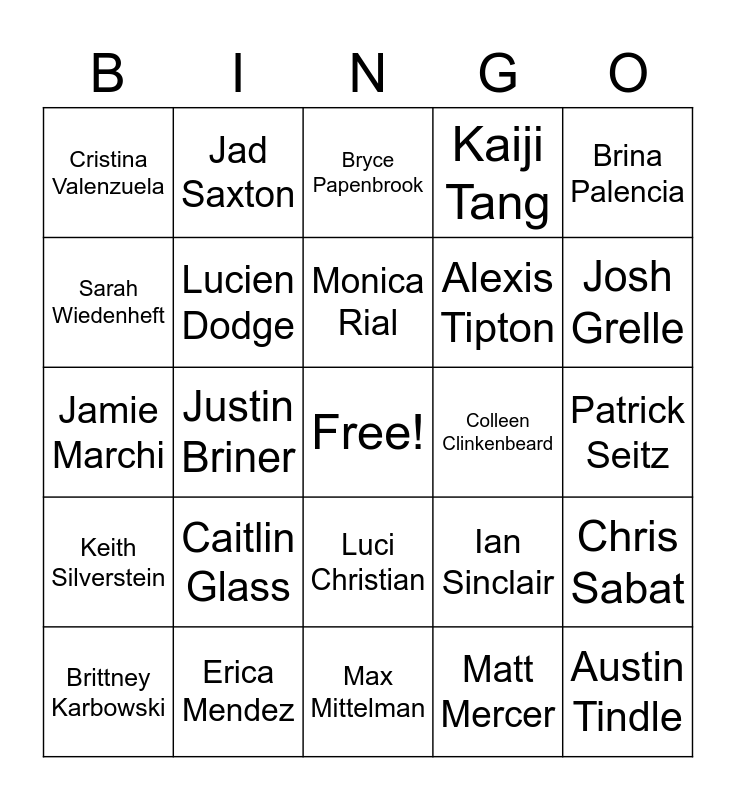 This bingo card has a free space and 24 words: Caitlin Glass, Erica Mendez, Monica Rial, Brittney Karbowski, Brina Palencia, Cristina Valenzuela, Sarah Wiedenheft, Jad Saxton, Colleen Clinkenbeard, Luci Christian, Alexis Tipton, Jamie Marchi, Ian Sinclair, Chris Sabat, Lucien Dodge, Matt Mercer, Patrick Seitz, Bryce Papenbrook, Josh Grelle, Justin Briner, Austin Tindle, Keith Silverstein, Kaiji Tang and Max Mittelman.