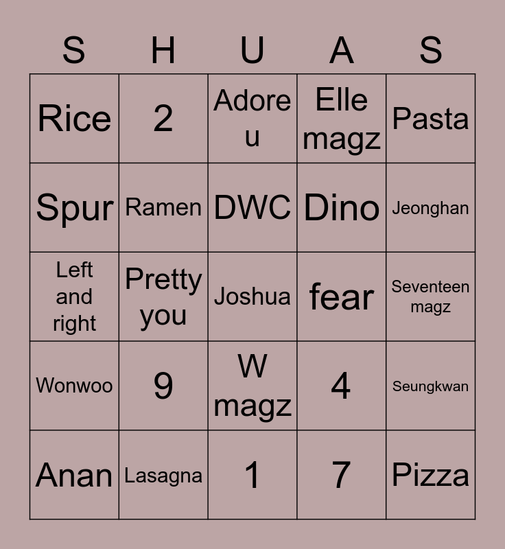 This bingo card has a free space and 24 words: 9, Lasagna, DWC, Anan, Pasta, Rice, Spur, 2, fear, W magz, Dino, Left and right, 4, Seungkwan, Ramen, 7, Seventeen magz, Adore u, Jeonghan, Pretty you, Pizza, Wonwoo, Elle magz and 1.