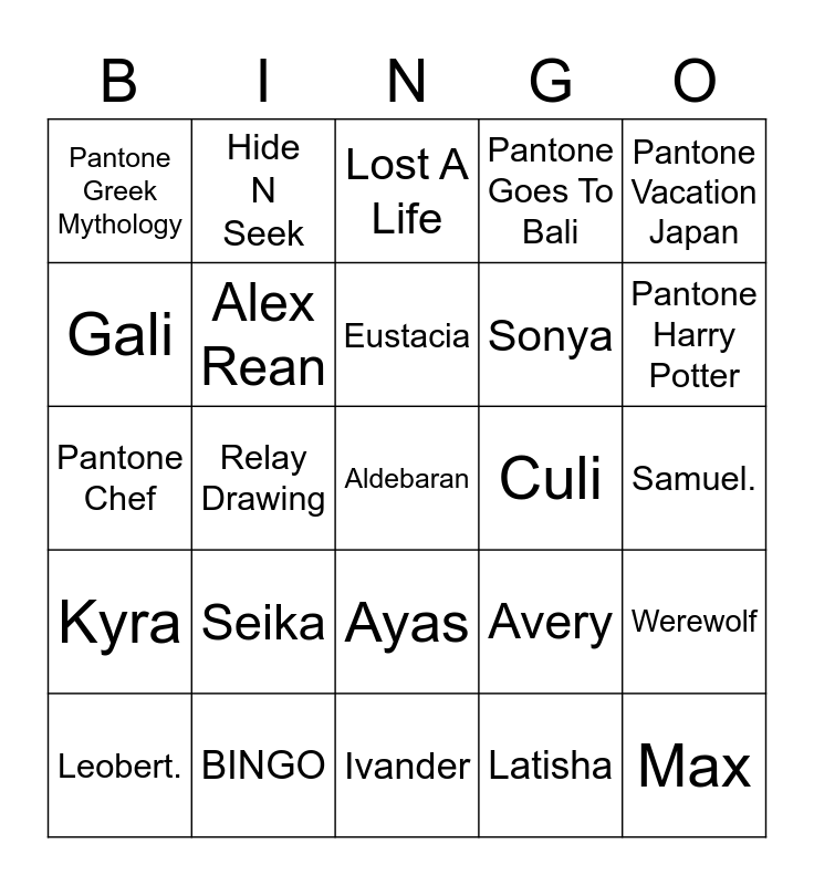 This bingo card has a free space and 24 words: Seika, BINGO, Eustacia, Leobert., Pantone Vacation Japan, Pantone Greek Mythology, Gali, Hide N Seek, Culi, Ayas, Sonya, Pantone Chef, Avery, Werewolf, Alex Rean, Latisha, Samuel., Lost A Life, Pantone Harry Potter, Relay Drawing, Max, Kyra, Pantone Goes To Bali and Ivander.