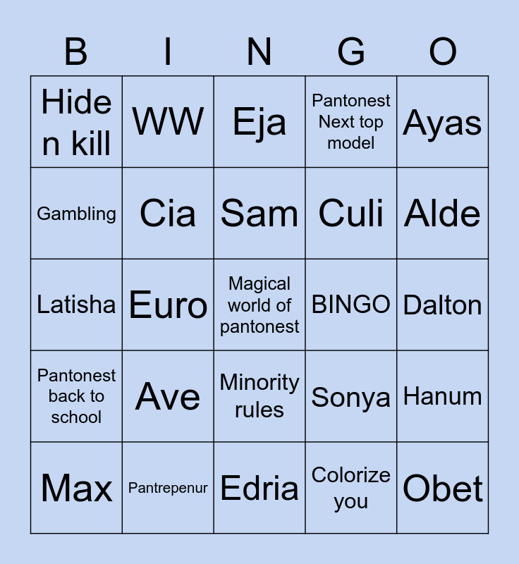 This bingo card has 25 words: Ave, Edria, Sam, Max, Ayas, Hide n kill, Gambling, WW, BINGO, Minority rules, Culi, Latisha, Sonya, Hanum, Cia, Obet, Dalton, Eja, Alde, Euro, Magical world of pantonest, Pantrepenur, Pantonest back to school, Pantonest Next top model and Colorize you.