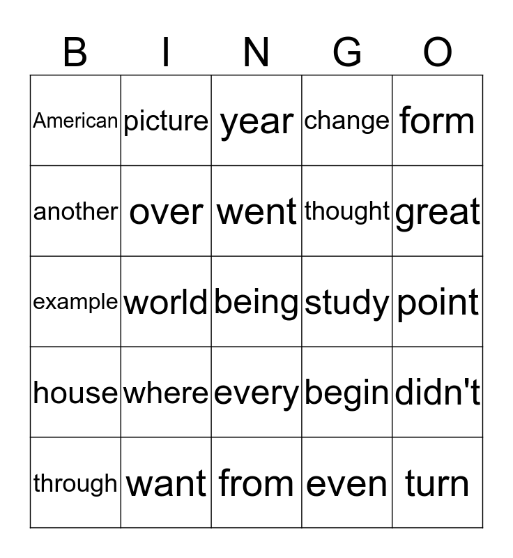 This bingo card has a free space and 24 words: where, want, went, through, form, American, another, picture, study, every, thought, example, begin, didn't, over, even, point, year, great, world, turn, house, change and from.