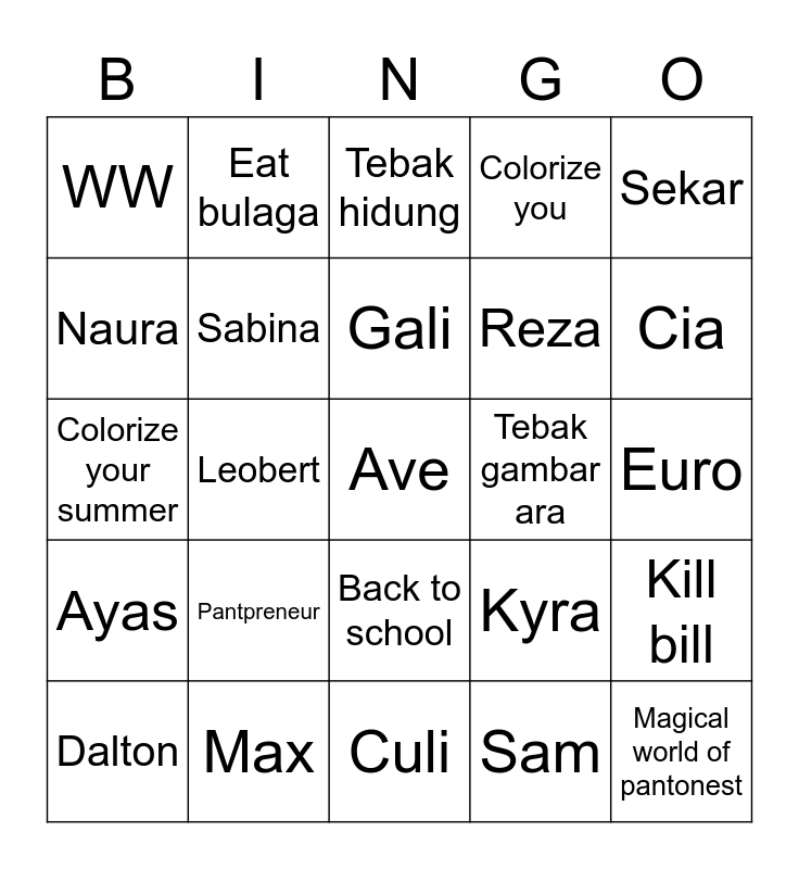 This bingo card has 25 words: Ayas, Max, Ave, Sam, Sekar, WW, Eat bulaga, Tebak hidung, Tebak gambar ara, Kill bill, Naura, Sabina, Culi, Kyra, Cia, Dalton, Leobert, Gali, Reza, Euro, Colorize your summer, Pantpreneur, Back to school, Colorize you and Magical world of pantonest.