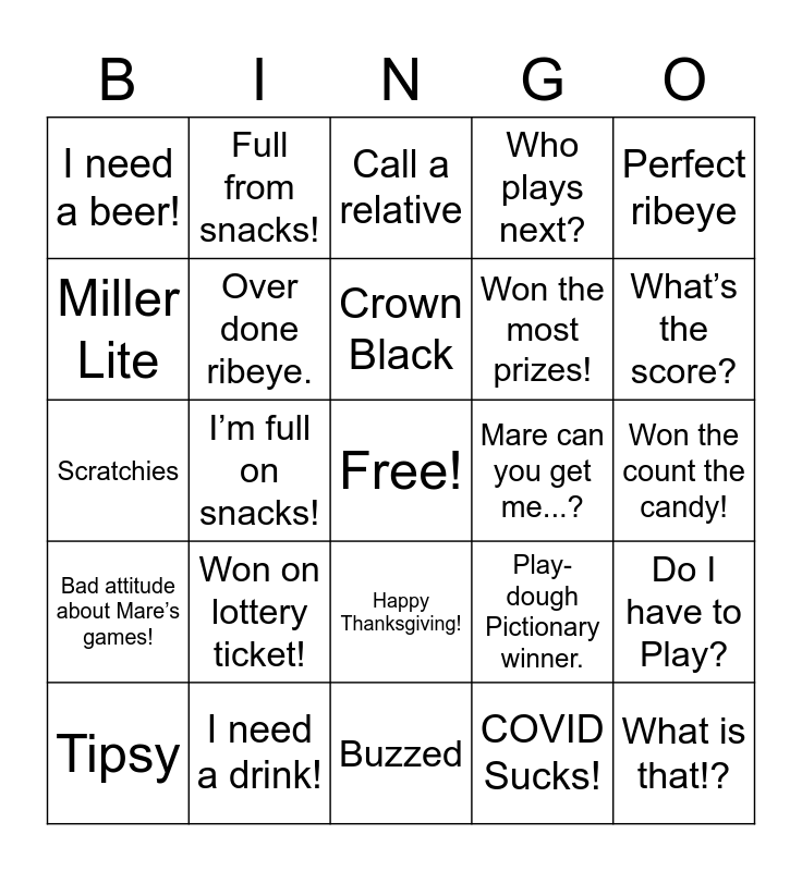 This bingo card has a free space and 24 words: Tipsy, Won on lottery ticket!, Crown Black, COVID Sucks!, Perfect ribeye, I need a beer!, Full from snacks!, Call a relative, Mare can you get me...?, Won the count the candy!, Scratchies, Over done ribeye., Play-dough Pictionary winner., Do I have to Play?, Miller Lite, I need a drink!, Buzzed, Who plays next?, What’s the score?, Bad attitude about Mare’s games!, I’m full on snacks!, Happy Thanksgiving!, Won the most prizes! and What is that!?.