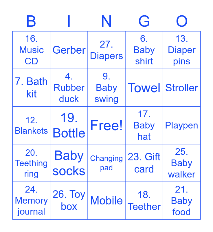 This bingo card has a free space and 35 words: Blankie, 2. High chair, 3. Teddy bear, 4. Rubber duck, Changing pad, 6. Baby shirt, 7. Bath kit, 8. Baby powder, 9. Baby swing, 10. Play gym, 12. Blankets, 13. Diaper pins, 14. Clothes, 15. Bib, 16. Music CD, 17. Baby hat, 18. Teether, 19. Bottle, 20. Teething ring, 21. Baby food, 23. Gift card, 24. Memory journal, 25. Baby walker, 26. Toy box, 27. Diapers, Stroller, Baby monitor, Baby lotion, Towel, Playpen, Bassinet, Mobile, Baby socks, Gerber and Baby book.