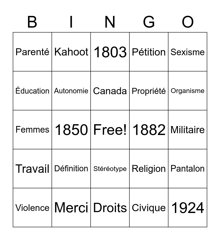This bingo card has a free space and 31 words: Droits, Mariage, 1850, 17, Parenté, 1803, Autonomie, Religion, 1882, Civique, Militaire, 1924, Égalité, Contrat, Organisme, Public, Pantalon, Définition, Travail, Stéréotype, Sexisme, Salaire, Violence, Kahoot, Propriété, Éducation, Pétition, Femmes, Merci, Canada and Minorité.