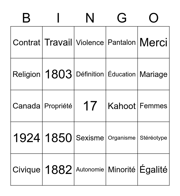 This bingo card has 31 words: Autonomie, Public, Propriété, Parenté, Contrat, Violence, 1803, Organisme, Kahoot, Minorité, Femmes, 17, Égalité, Salaire, Mariage, Militaire, Stéréotype, 1850, 1924, Sexisme, Merci, Droits, Civique, Travail, Éducation, Religion, Pantalon, Canada, 1882, Définition and Pétition.