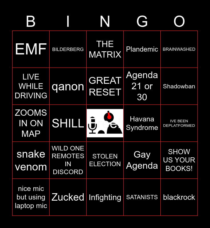 This bingo card has a free space and 156 words: FREQUENCIES, "THEM", CRINGEY SLUR, Websites Printed Out, ANTI MASK, SHEDDING, CHEMTRAILS, Hunter's Laptop, VACCINE HESITANT, Vitamin D, MICROCHIP, PATENTS, ZOOMS IN ON MAP, FB LIVE IN CAR, LIVE WHILE DRIVING, GREAT RESET, FALSE FLAG, POINTS PHONE AT COMPUTER, BIRB!!, Phone Notification, LUCIFARIANS, HELLO!, Rothschilds, TROLLS, DOGGO, FB IS CENSORING ME, SHILL, BLAMES 5G, WE DO NOT CONSENT, DRAG QUEEN, VERTICAL VIDEO, DEEP STATE, DO YOUR OWN RESEARCH, WOKE, SATAN, SOMEONE DANCES, DEPOPULATION, ANONYMOUS, SHOW US YOUR BOOKS!, DESK FULL OF PAPERS, NEW WORLD ORDER, X-FILES REFERENCED, GLOBALISTS, COMMIES, NATURAL IMMUNITY, Gay Agenda, Grooming, SOROS, Common Law, MARK OF THE BEAST, Fake Legal Jargon, Weird Flag Shit, ITS THE JEWS, BILDERBERG, PEDOPHILES, Plandemic, CRIMES AGAINST HUMANITY, ELON, EPSTEIN, ITS GOD, ITS THE DEVIL, IVE BEEN DEPLATFORMED, Scamdemic, Agenda 21 or 30, CHILD TRAFFICKING, ELITES, THE MATRIX, RED PILL, Cabal, EMF, BOARD OF SUPES, IMMUNO- COMPROMISED, WILD ONE REMOTES IN DISCORD, SATANISTS, NEW FOLLOW, NEW SUB, BABY THROWS MONEY, RAIIIIID, ANTI- VAXX, MARICOPA, Climate Hoax, ROCKAFELLERS, NUMEROLOGY, FEMA CAMPS, THE CHILDREN, D.E.W., Social Credit, Chi-Coms, WALK AND TALK, STOLEN ELECTION, Biolab, Shadowban, UNMUTE YOURSELF, Cat anywhere on screen, 5D earth, NOWSPACE, QUANTUM GRAMMAR, MUZZLE, JAB, Zucked, FAKE GOVERNMENT TITLE, USA IS A CORPORATION, SCIENTOLOGY CONNECTION, PRINTED OUT KEYWORDS, SHERIFFS ARE SUPREME AUTHORITY, Drinking Pee, Takes Off Glasses, Puts On Glasses, Convoy, Leftist Audio, Dissent in live chat, Sings A Little Song, Also A Musician, Nano Tech, Groomer, They Don't Want You To Know, died suddenly, blood clots, gun in the background, GREAT REPLACEMENT, BRAINWASHED, Kissinger, tel- lie- vision, What did I walk into?, Nerdy Tech Rabbithole, mud flood, free energy, weather modification, Jim Lee's Website, Chat Is Off Topic, CBDC, Havana Syndrome, D.U.M.B.S., Infighting, Lost Tech, Look At The Data, Moon Landing, Died Suddenly, cure all, anecdote = evidence, snake venom, nice mic but using laptop mic, tunnels, getty, mk ultra, aliens, atlantis, spiritual warfare, anti christ, bill gates, qanon, W.E.F., guest monologue, myocarditis, blackrock and 9/11.