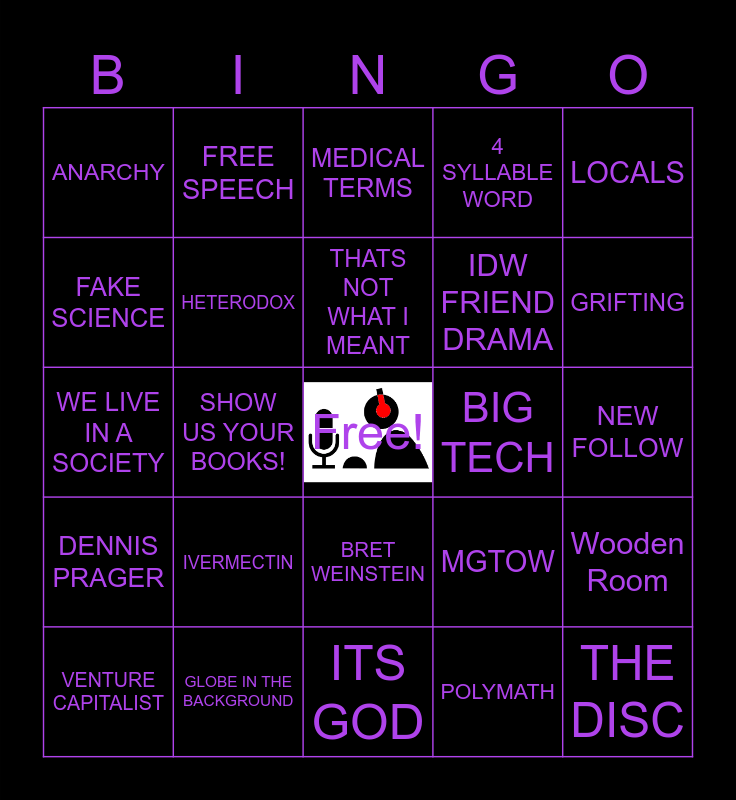 This bingo card has a free space and 89 words: BAD FAITH, RIDICULE, BRET WEINSTEIN, ERIC WEINSTEIN, CRINGEY SLUR, GALAXY BRAIN, PHRENOLOGY, SAM HARRIS, DAVE RUBIN, JORDAN PETERSON, BEEF DAUGHTER, SHILLS PRODUCT, Wooden Room, NEW FOLLOW, NEW SUB, THATS NOT WHAT I MEANT, FEMINISM, MARXISM, COMMUNISM, SOCIALISM, ITS THE GAYS, ITS THE JEWS, ITS GOD, STEVEN CROWDER, WE LIVE IN A SOCIETY, GLOBE IN THE BACKGROUND, BRAINWASHED, ANTIFA, FASCISM, THE LEFT, 4 SYLLABLE WORD, SHOW US YOUR BOOKS!, POLITICALLY CORRECT, ANARCHY, Tone Policing, MEDICAL TERMS, FAKE SCIENCE, GOVERNMENT HANDOUTS, GRIFTING, VENTURE CAPITALIST, DENNIS PRAGER, PRAGER U, THE QUARTERING, POP PSYCHOLOGY, MGTOW, BIG TECH, SHADOWBANNED, CENSORSHIP, BANNED ON TWITTER, FREE SPEECH, MENS RIGHTS, Questatement, STRAWMAN, INTENT, INTELLECTUAL, AD HOMINEM, GENDER, I'M A "INSERT THING THEY'RE NOT", IQ, CRITICAL THEORY, Dave Doesn't Want To Get Bogged Down, CULTURAL MARXISM, IDEAS!, THOUGHTFUL LOOK, HOW DARE THEY MOCK ME, WORD SALAD, Give Me Another Example, CRITICAL RACE THEORY, WOKE, IVERMECTIN, THE DISC, STOLEN NOBEL PRIZE, MILD CRITICISM, IDW FRIEND DRAMA, HETERODOX, POLYMATH, ONLY WE CAN FIX SOCIETY, "Film", NICE MIC BUT USING LAPTOP MIC, OVERLY LONG QUESTION, LOCALS, SUBSTACK, Overly Dramatic Description Of Discussion, Our institutions are failing us, What did I walk into?, HK Is Off Topic, Chat Is Off Topic, Died Suddenly and constitutional republic.