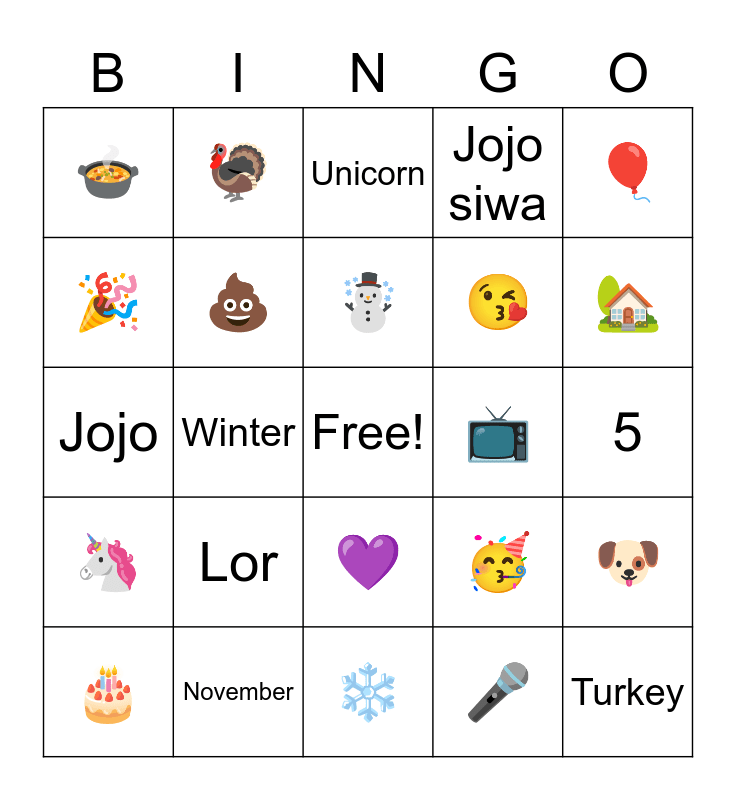 This bingo card has a free space and 24 words: 🎂, Lor, ☃️, 🎤, 🎈, 🍲, 🦃, Unicorn, 📺, 5, Jojo, 💩, 🥳, 🐶, 🎉, November, ❄️, Jojo siwa, 🏡, 🦄, Winter, 💜, 😘 and Turkey.