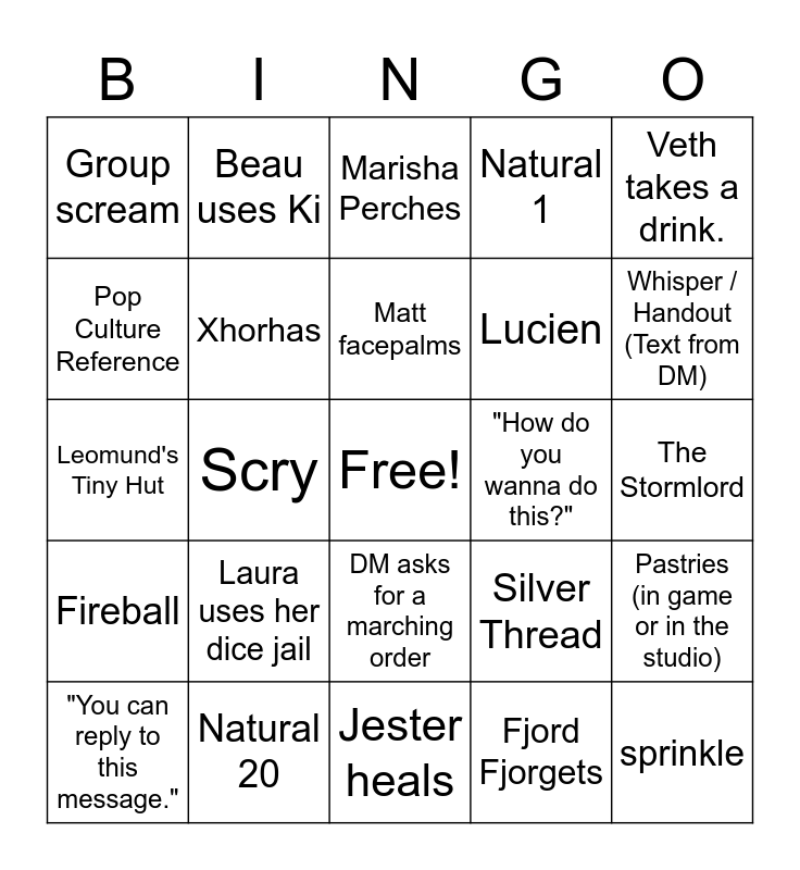 This bingo card has a free space and 43 words: frumpkin, sprinkle, Jester uses Sending, "You can reply to this message.", Yasha Rages, Fjord Fjorgets, Marisha Perches, "ok ok ok ok ok ok...", Veth takes a drink., Natural 20, Natural 1, "How do you wanna do this?", DM asks for a marching order, Laura uses her dice jail, Cad makes tea, Jester heals, PC goes unconscious, Leomund's Tiny Hut, Widogast's Nein-Sided Tower, Whisper / Handout (Text from DM), Beau uses Ki, Map/Visual Aid, Sam shills a sponsor, Group scream, The Traveler, The Stormlord, The Wildmother, They visit a Cobalt Soul HQ, Silver Thread, Fireball, Jester sketches / grafitti, Pastries (in game or in the studio), "You can certainly try", Scry, Essek, The Gentleman, The Ruby of the Sea, Matt facepalms, Pop Culture Reference, Lucien, Polymorph, Xhorhas and Teleportation.