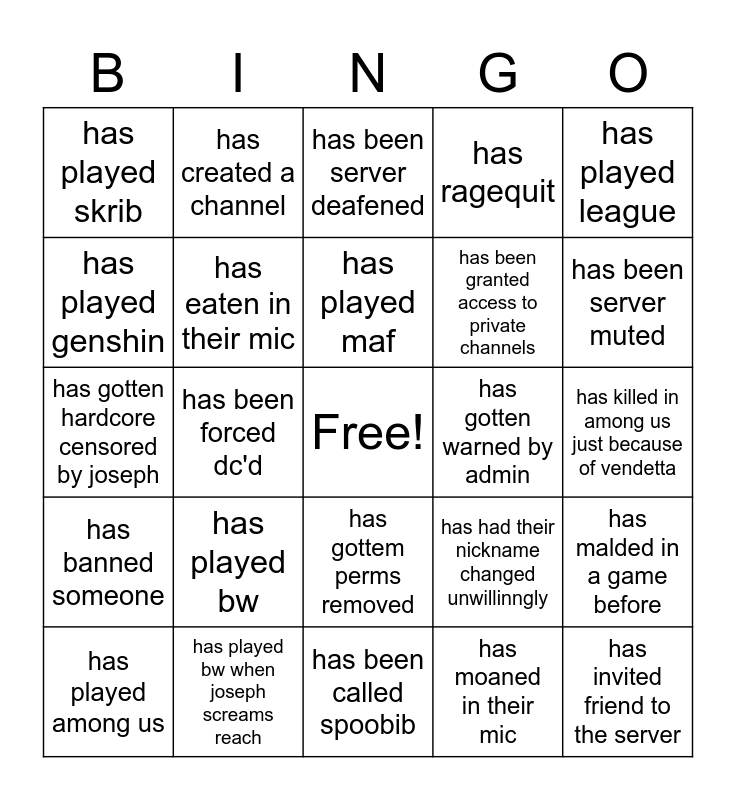 This bingo card has a free space and 24 words: has played bw, has played bw when joseph screams reach, has played maf, has played among us, has played league, has played skrib, has played genshin, has created a channel, has gotten warned by admin, has gottem perms removed, has been granted access to private channels, has gotten hardcore censored by joseph, has had their nickname changed unwillinngly, has malded in a game before, has eaten in their mic, has moaned in their mic, has killed in among us just because of vendetta, has been server deafened, has been server muted, has been forced dc'd, has invited friend to the server, has banned someone, has ragequit and has been called spoobib.